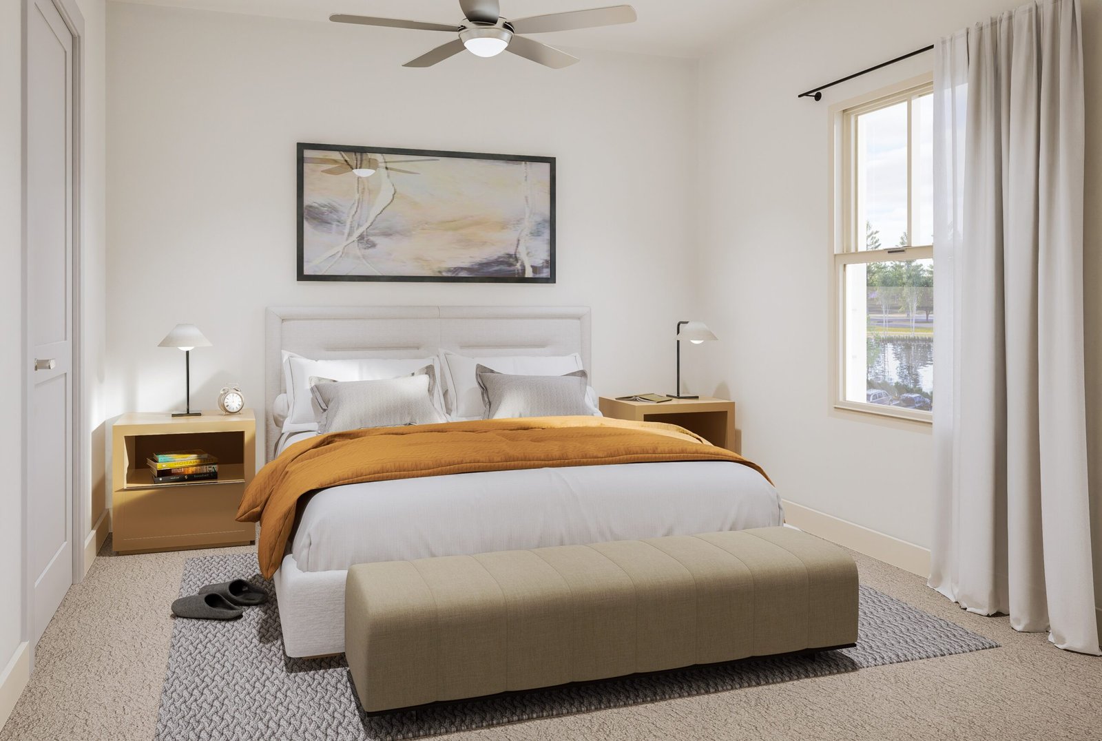 The luxurious master suite includes a private en-suite bathroom and a walk-in closet, creating a serene personal retreat. Two additional bedrooms offer flexibility for family, guests, or a home office, supported by a second full bathroom with stylish finishes.